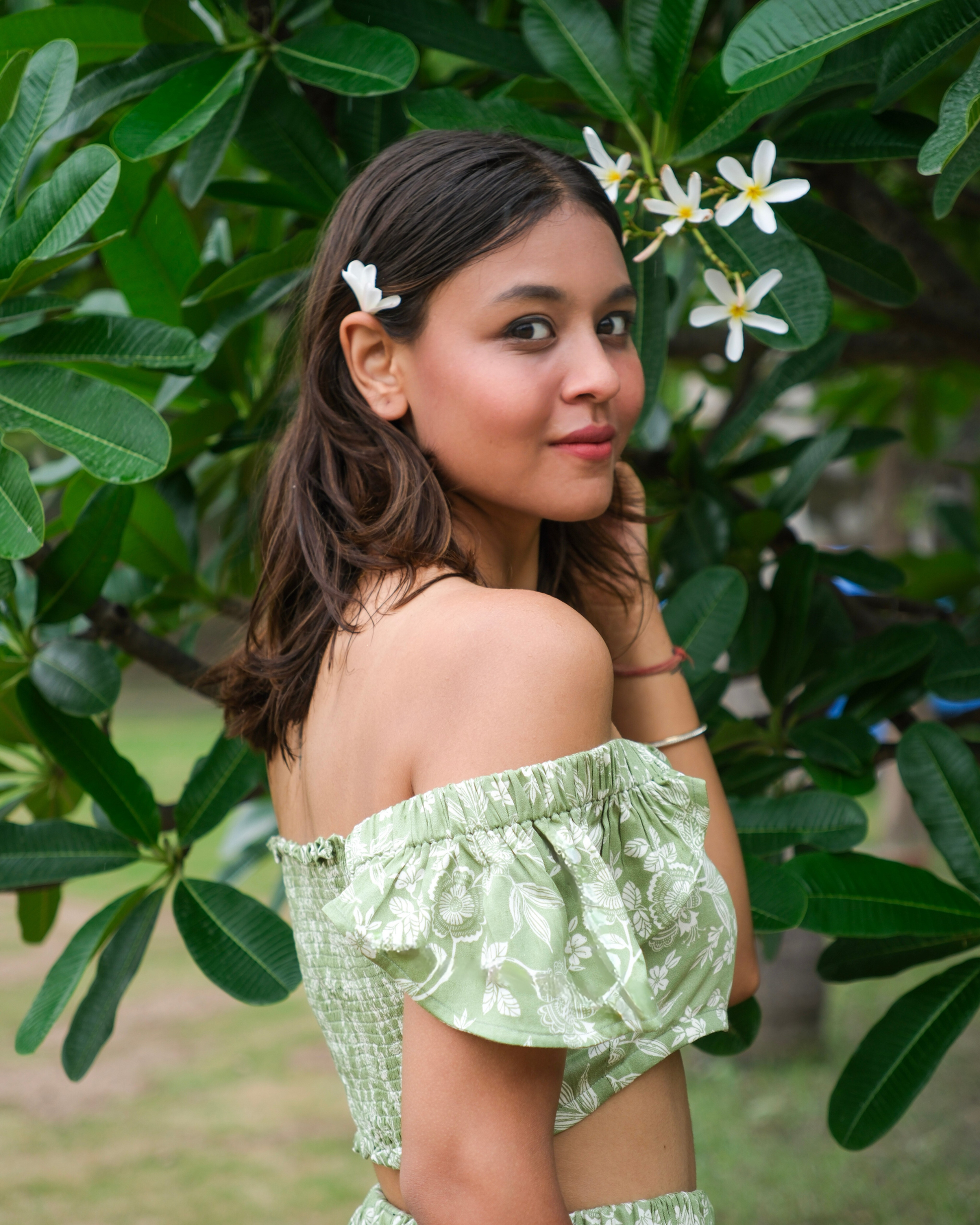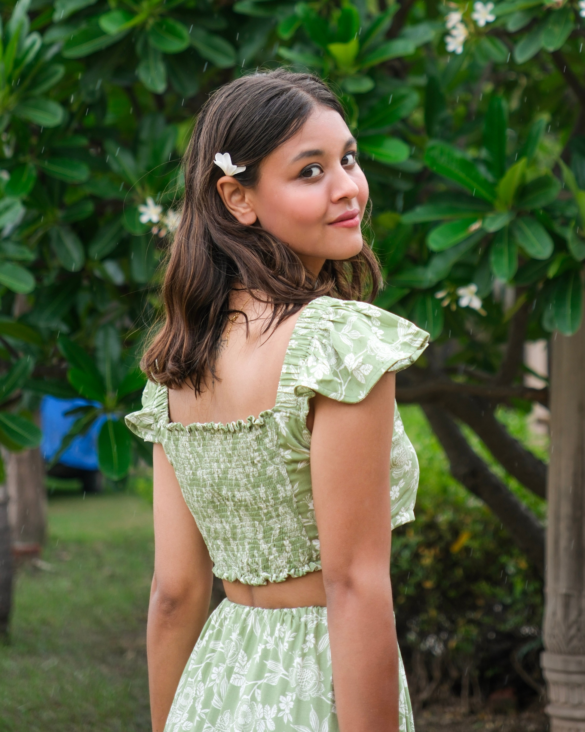 The Fernsong Crop Top embraces nature-inspired elegance with a fresh, botanical vibe. Featuring a delicate pattern and lightweight fabric, this top offers effortless comfort and breathability. Its subtle ruffle sleeve detail adds a touch of femininity, making it great for both relaxed days and casual outings. can be paired with denim or flowing skirts, the top brings a serene, natural mood to every look, capturing the essence of calm and understated style.